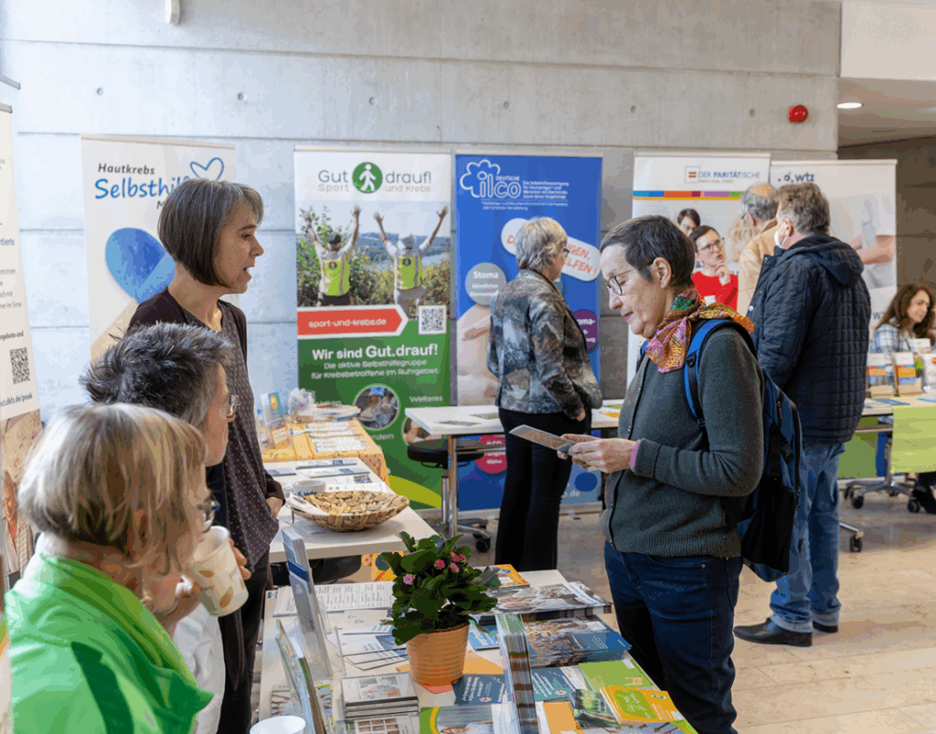 Neben den Workshops und Keynotes waren zahlreiche Selbsthilfegruppen vertreten, die den Krebstag Ruhr mit ihrer Präsenz an eigenen Infoständen und ihrer Patientenexpertise enorm bereicherten. Die Besucher*innen konnten sich zudem bei den vielfältigen Unterstützungsangeboten der UME Informationen im direkten Kontakt einholen und aktiv teilnehmen – im Selbsthilfe-Café, bei praxisnahen Aktionsangeboten wie dem partiellen Hautkrebsscreening, Schnupper-Sport- und Bewegungseinheiten, Achtsamkeits-Impulsen und auch Vorträgen zu Physiotherapie und psychoonkologischer Begleitung. So konnten Betroffene und Zugehörige direkt praktische Hilfestellungen für ihren Alltag erfahren.