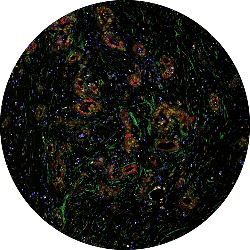 Mikroskopieaufnahme von Pankreastumorgewebe, die Tumorzellen, Blutgefäße, Fibroblasten und verschiedene Immunzellpopulationen zeigt, welche mit fluoreszierenden Farben markiert wurden. / Bildrechte: Georgia Antonopoulou und Prof. Dr. Jens Siveke